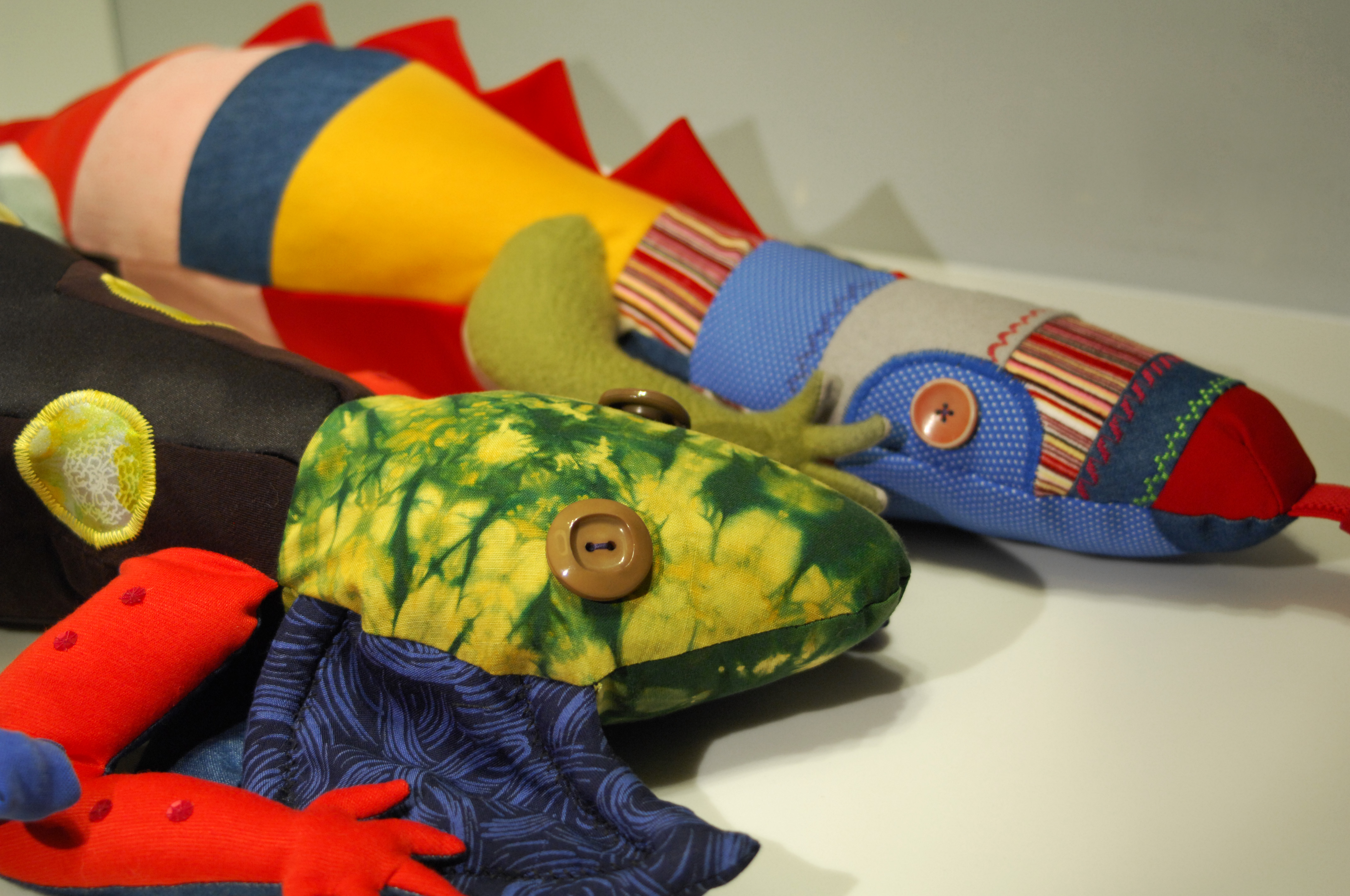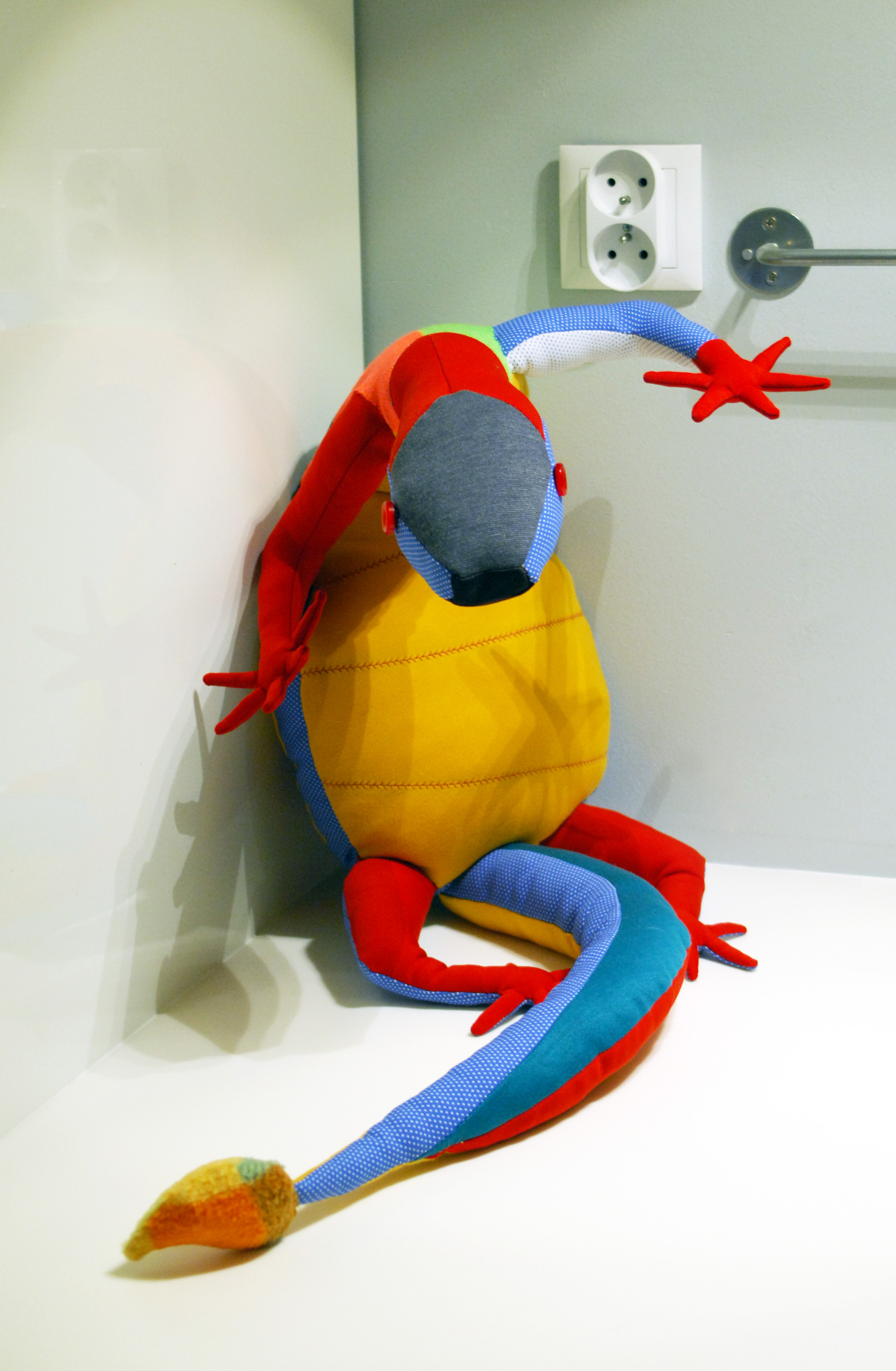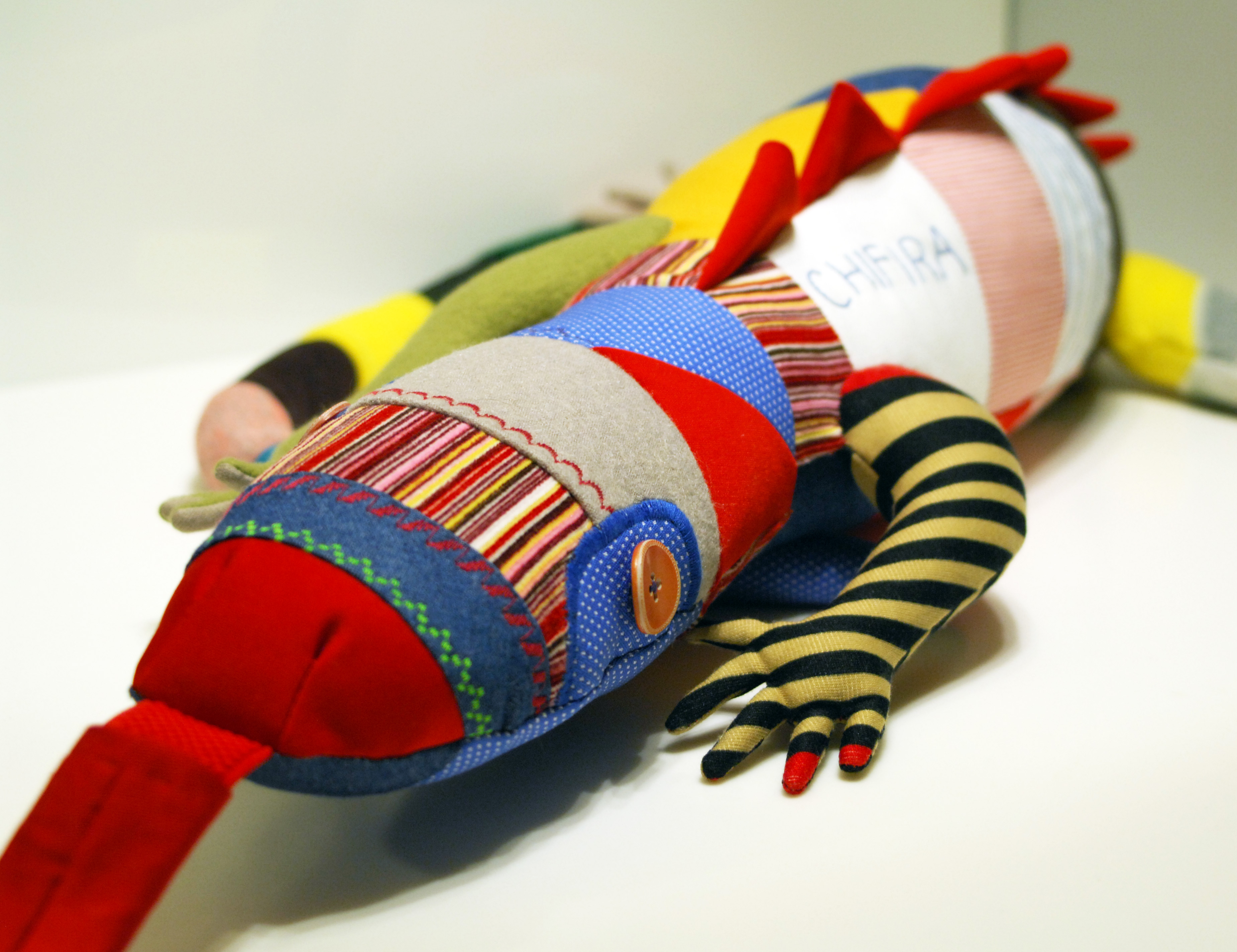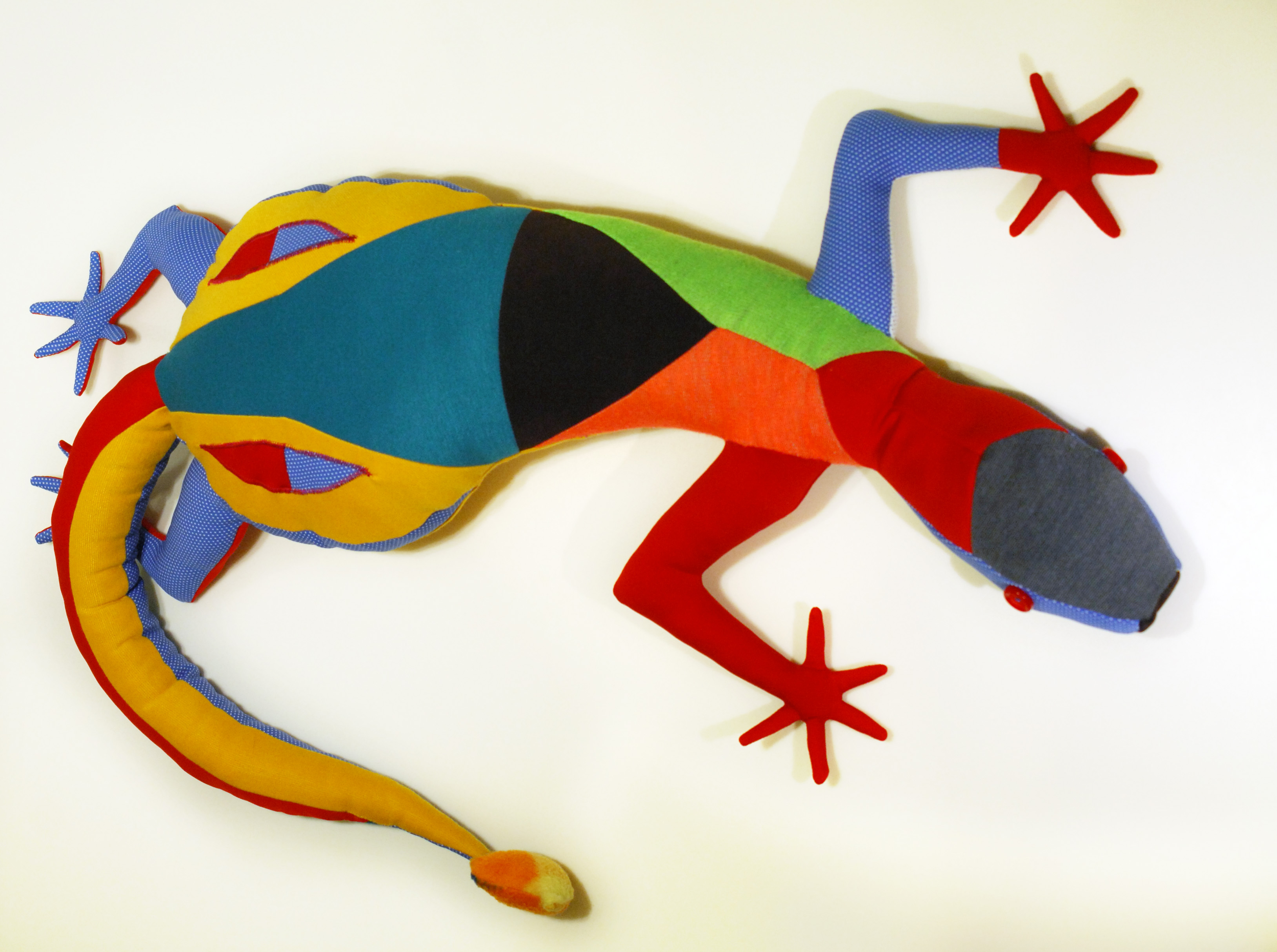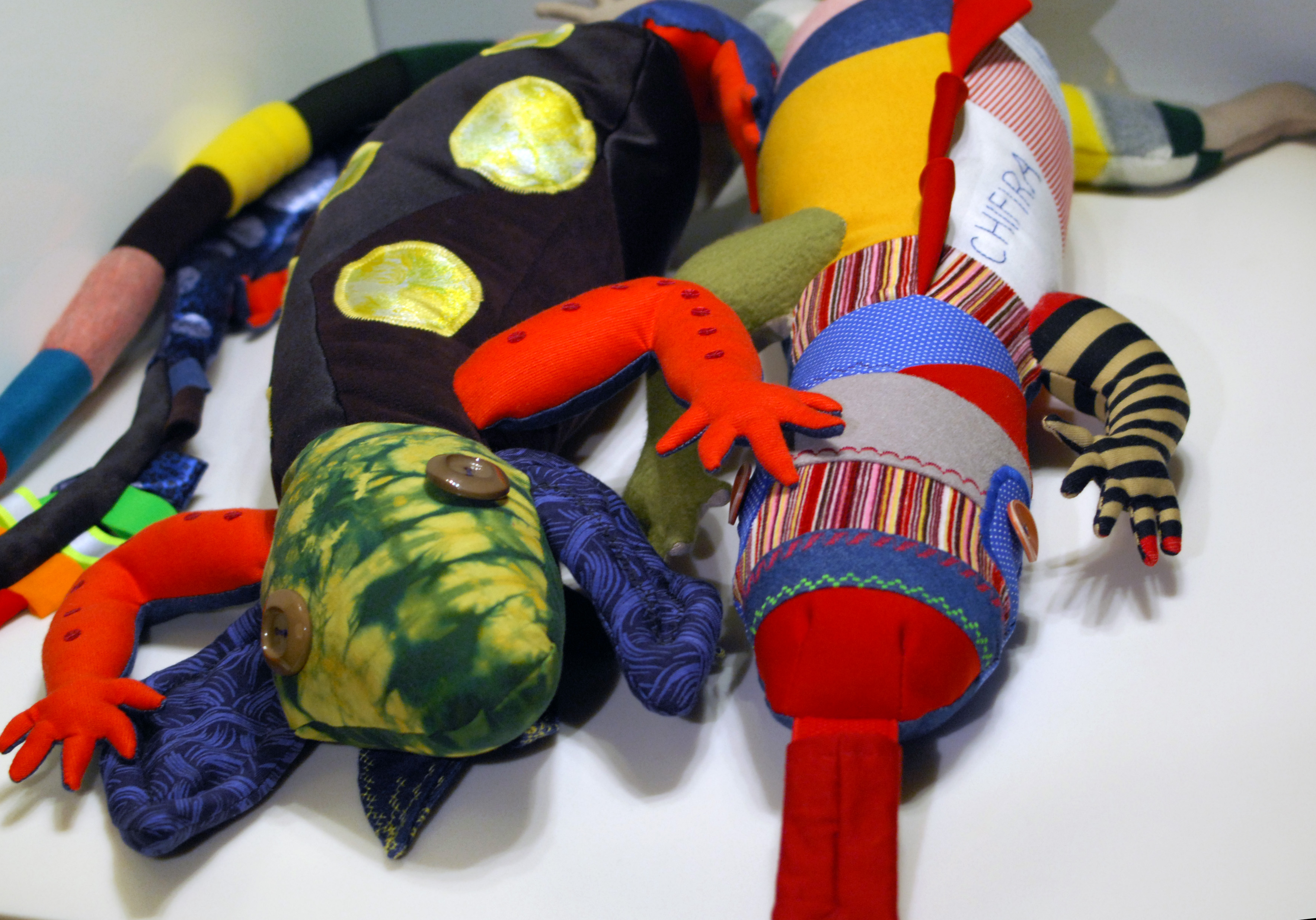 Te kolorowe jaszczurki powstały na wystawę „Idź na żywioł” dla Muzeum Łazienki Królewskie. Najpierw odbyły się warsztaty, na których dzieci wspólnie narysowały cztery jaszczurki, które ja później uszyłam.